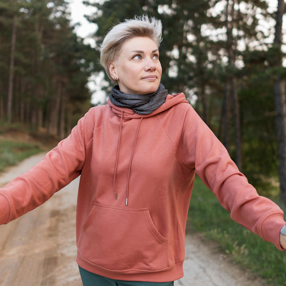 A soft, midweight hoodie that settles into your everyday rotation. This clean, minimalist pullover pairs a cozy fleece interior with a neatly knit, seam-free body for a smooth silhouette. The adjustable hood and roomy kangaroo pocket keep hands warm on chilly walks, while the tag-free neck and recycled-polyester content add practical comfort and subtle sustainability. Wear it around town, on quiet mornings, or layered for evening hangs—it's built to feel like an easy, familiar layer you reach for again and again.